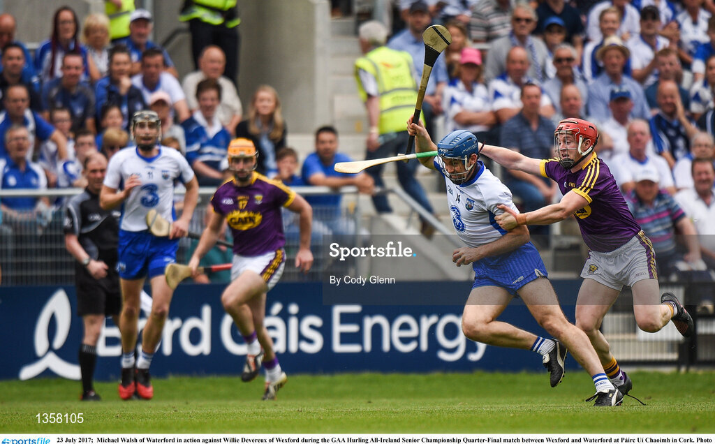 23 July 2017; Michael Walsh of Waterford in action against Willie Devereux of Wexford during the GAA Hurling All-Ireland Senior Championship Quarter-Final match between Wexford and Waterford at Páirc Uí Chaoimh in Cork. Photo by Cody Glenn/Sportsfile
