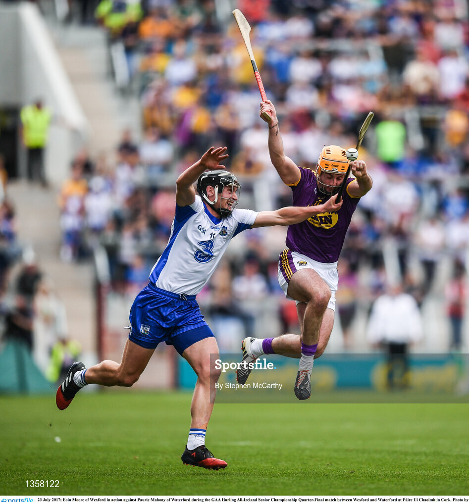 23 July 2017; Eoin Moore of Wexford in action against Pauric Mahony of Waterford during the GAA Hurling All-Ireland Senior Championship Quarter-Final match between Wexford and Waterford at Páirc Uí Chaoimh in Cork. Photo by Stephen McCarthy/Sportsfile