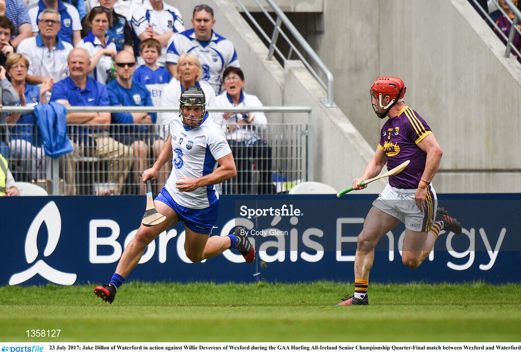 23 July 2017; Jake Dillon of Waterford in action against Willie Devereux of Wexford during the GAA Hurling All-Ireland Senior Championship Quarter-Final match between Wexford and Waterford at Páirc Uí Chaoimh in Cork. Photo by Cody Glenn/Sportsfile