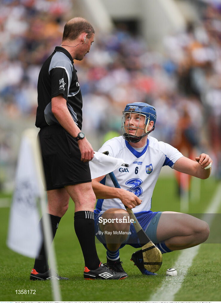 23 July 2017; Austin Gleeson of Waterford chatting with linesman Sean Cleere as he waits to take a line ball during the GAA Hurling All-Ireland Senior Championship Quarter-Final match between Wexford and Waterford at Páirc Uí Chaoimh in Cork. Photo by Ray McManus/Sportsfile