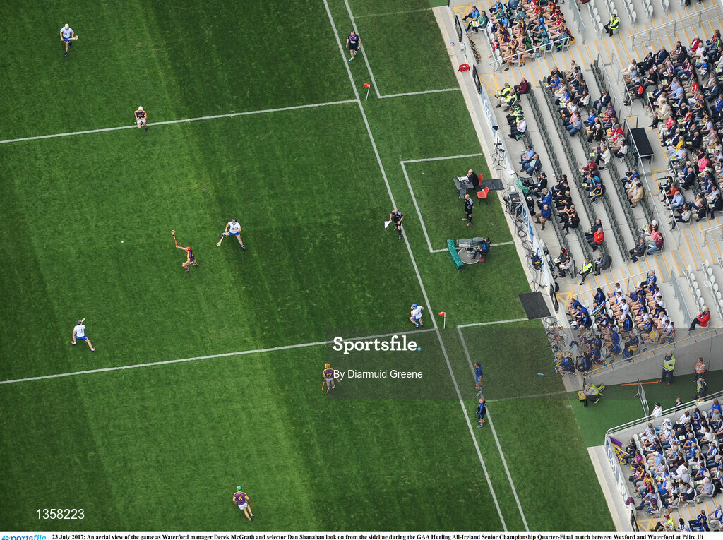 23 July 2017; An aerial view of the game as Waterford manager Derek McGrath and selector Dan Shanahan look on from the sideline during the GAA Hurling All-Ireland Senior Championship Quarter-Final match between Wexford and Waterford at Páirc Uí Chaoimh in Cork. Photo by Diarmuid Greene/Sportsfile