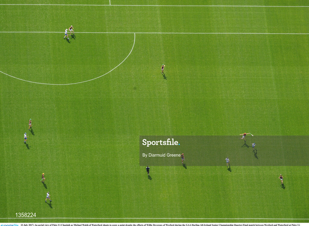 23 July 2017; An aerial view of Páirc Ui Chaoimh as Michael Walsh of Waterford shoots to score a point despite the efforts of Willie Devereux of Wexford during the GAA Hurling All-Ireland Senior Championship Quarter-Final match between Wexford and Waterford at Páirc Uí Chaoimh in Cork. Photo by Diarmuid Greene/Sportsfile