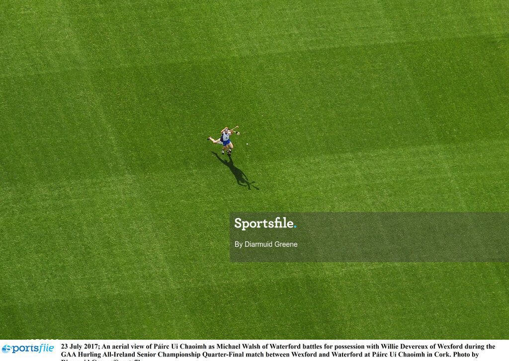 23 July 2017; An aerial view of Páirc Ui Chaoimh as Michael Walsh of Waterford battles for possession with Willie Devereux of Wexford during the GAA Hurling All-Ireland Senior Championship Quarter-Final match between Wexford and Waterford at Páirc Uí Chaoimh in Cork. Photo by Diarmuid Greene/Sportsfile