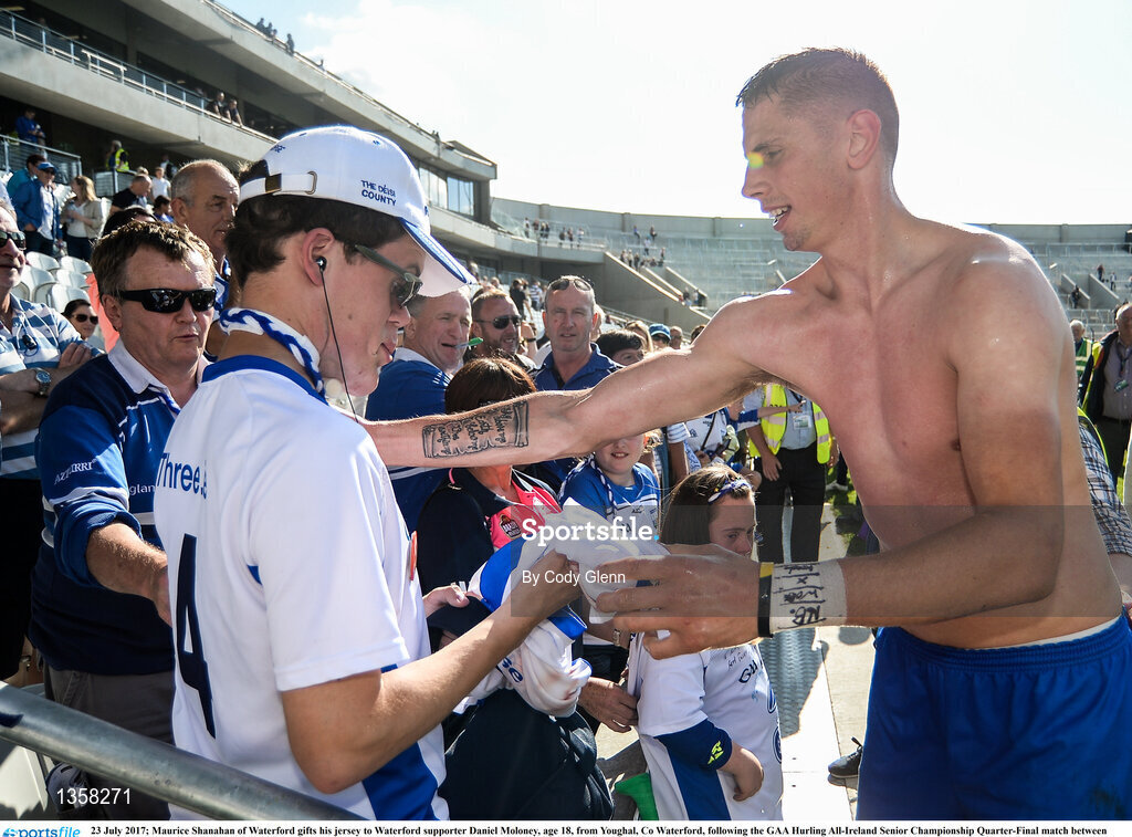 23 July 2017; Maurice Shanahan of Waterford gifts his jersey to Waterford supporter Daniel Moloney, age 18, from Youghal, Co Waterford, following the GAA Hurling All-Ireland Senior Championship Quarter-Final match between Wexford and Waterford at Páirc Uí Chaoimh in Cork. Photo by Cody Glenn/Sportsfile