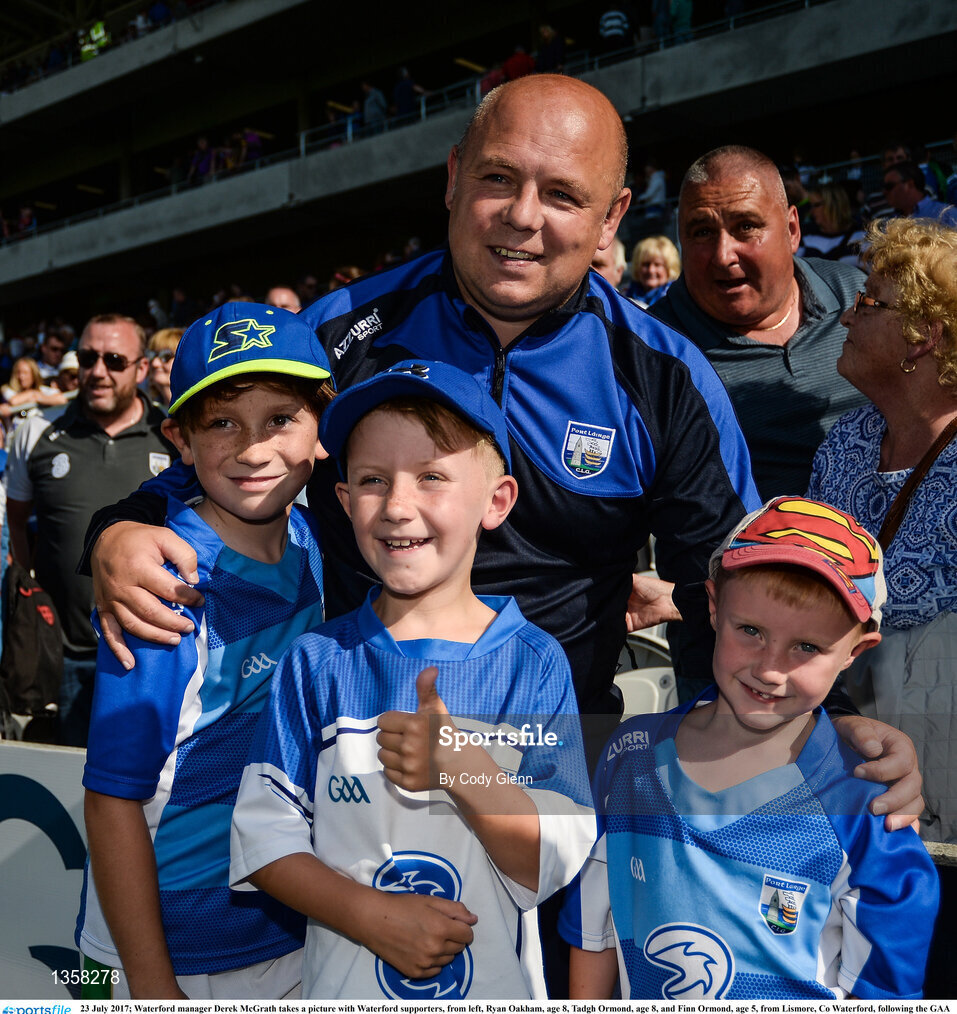 23 July 2017; Waterford manager Derek McGrath takes a picture with Waterford supporters, from left, Ryan Oakham, age 8, Tadgh Ormond, age 8, and Finn Ormond, age 5, from Lismore, Co Waterford, following the GAA Hurling All-Ireland Senior Championship Quarter-Final match between Wexford and Waterford at Páirc Uí Chaoimh in Cork. Photo by Cody Glenn/Sportsfile