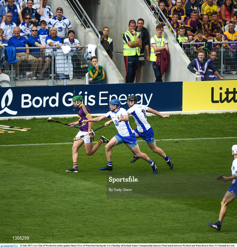 23 July 2017; Lee Chin of Wexford in action against Shane Fives of Waterford during the GAA Hurling All-Ireland Senior Championship Quarter-Final match between Wexford and Waterford at Páirc Uí Chaoimh in Cork. Photo by Cody Glenn/Sportsfile