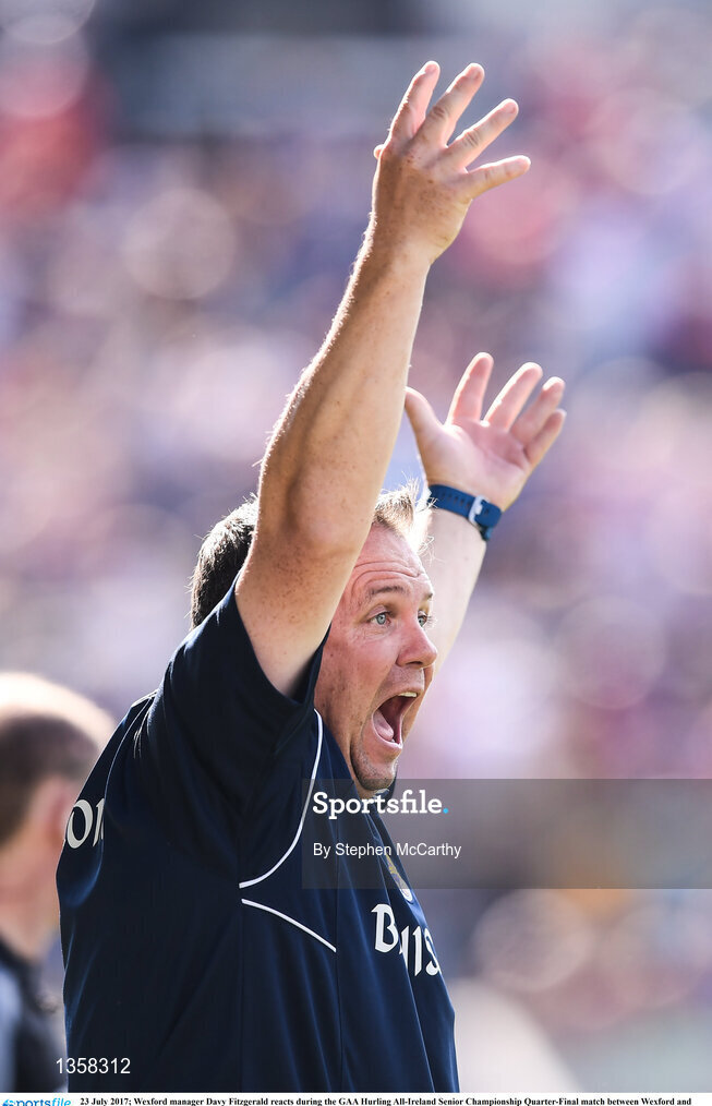 23 July 2017; Wexford manager Davy Fitzgerald reacts during the GAA Hurling All-Ireland Senior Championship Quarter-Final match between Wexford and Waterford at Páirc Uí Chaoimh in Cork. Photo by Stephen McCarthy/Sportsfile