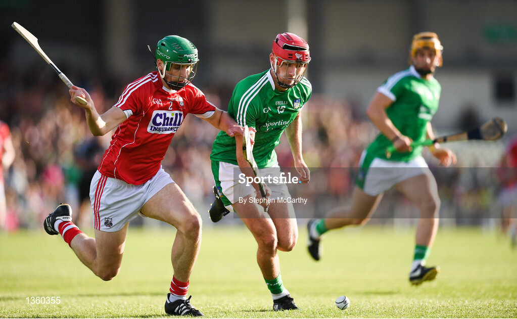 26 July 2017; Barry Nash of Limerick in action against John Cashman of Cork during the Bord Gáis Energy Munster GAA Hurling Under 21 Championship Final match between Limerick and Cork at the Gaelic Grounds in Limerick. Photo by Stephen McCarthy/Sportsfile