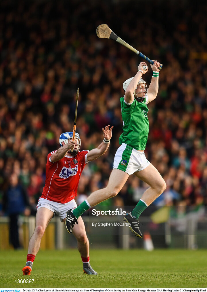 26 July 2017; Cian Lynch of Limerick in action against Sean O'Donoghue of Cork during the Bord Gáis Energy Munster GAA Hurling Under 21 Championship Final match between Limerick and Cork at the Gaelic Grounds in Limerick. Photo by Stephen McCarthy/Sportsfile
