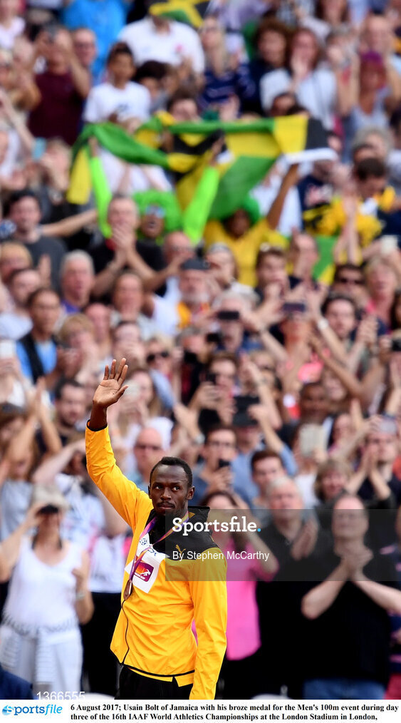 6 August 2017; Usain Bolt of Jamaica with his broze medal for the Men's 100m event during day three of the 16th IAAF World Athletics Championships at the London Stadium in London, England. Photo by Stephen McCarthy/Sportsfile