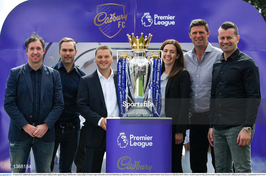 9 August 2017; England and Liverpool football legend, Robbie Fowler, touched down in Dublin today to join Cadbury Premier League ambassadors and Irish football heroes, Niall Quinn, Shay Given and his former Liverpool teammate Jason McAteer, to officially launch Cadbury’s brand new partnership with the Premier League, to become their ‘Official Snack Partner’. Accompanied by the Premier League Trophy, the four footballing greats descended on Dublin’s Sean O’Casey Bridge this afternoon, which Cadbury transformed into a replica players’ tunnel to celebrate their sponsorship launch – giving pedestrians a momentary snapshot of the atmosphere players experience, as they are led on to a pitch. In attendance at the launch are from left, Robbie Fowler, Cadbury Premier League Ambassador Jason McAteer, Managing Director Mondelez Ireland, Eoin Kellett, Cadbury Ireland Brand Manager Mary Moran, Cadbury Premier League Ambassadors Niall Quinn and Shay Given. Photo by Brendan Moran/Sportsfile