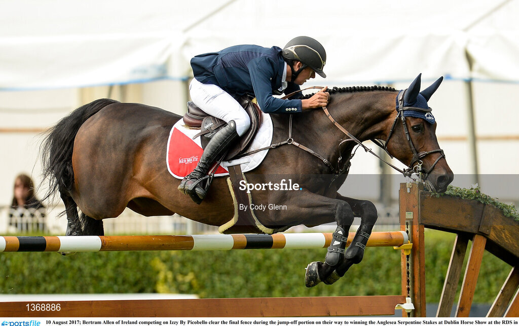 10 August 2017; Bertram Allen of Ireland competing on Izzy By Picobello clear the final fence during the jump-off portion on their way to winning the Anglesea Serpentine Stakes at Dublin Horse Show at the RDS in Ballsbridge, Dublin. Photo by Cody Glenn/Sportsfile