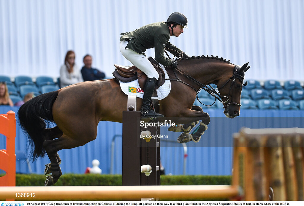 10 August 2017; Greg Broderick of Ireland competing on Chinook II during the jump-off portion on their way to a third place finish in the Anglesea Serpentine Stakes at Dublin Horse Show at the RDS in Ballsbridge, Dublin. Photo by Cody Glenn/Sportsfile
