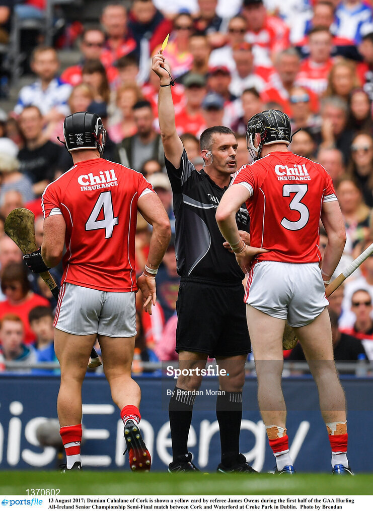 13 August 2017; Damian Cahalane of Cork is shown a yellow card by referee James Owens during the first half of the GAA Hurling All-Ireland Senior Championship Semi-Final match between Cork and Waterford at Croke Park in Dublin. Photo by Brendan Moran/Sportsfile