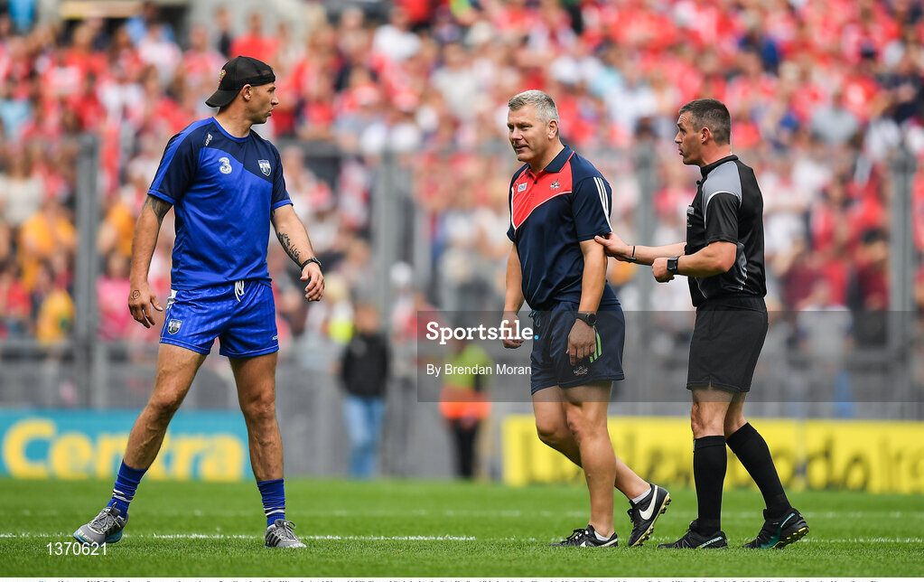 13 August 2017; Referee James Owens speaks to selectors Dan Shanahan, left, of Waterford and Diarmuid O'Sullivan of Cork during the GAA Hurling All-Ireland Senior Championship Semi-Final match between Cork and Waterford at Croke Park in Dublin. Photo by Brendan Moran/Sportsfile