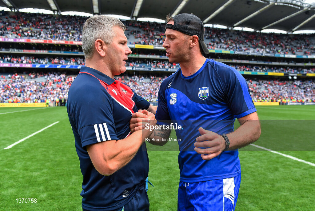 13 August 2017; Waterford selector Dan Shanahan, right, shakes hands with Cork selector Diarmuid O'Sullivan after the GAA Hurling All-Ireland Senior Championship Semi-Final match between Cork and Waterford at Croke Park in Dublin. Photo by Brendan Moran/Sportsfile
