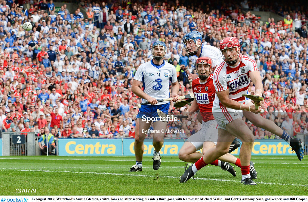 13 August 2017; Waterford's Austin Gleeson, centre, looks on after scoring his side's third goal, with team-mate Michael Walsh, and Cork's Anthony Nash, goalkeeper, and Bill Cooper during the GAA Hurling All-Ireland Senior Championship Semi-Final match between Cork and Waterford at Croke Park in Dublin. Photo by Piaras Ó Mídheach/Sportsfile