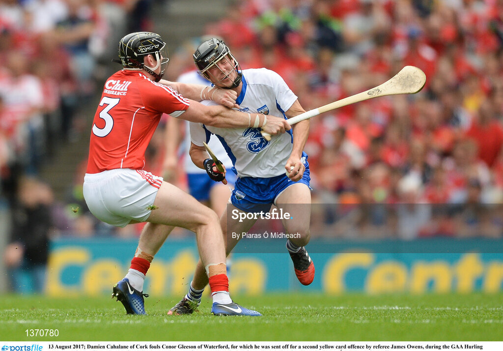 13 August 2017; Damien Cahalane of Cork fouls Conor Gleeson of Waterford, for which he was sent off for a second yellow card offence by referee James Owens, during the GAA Hurling All-Ireland Senior Championship Semi-Final match between Cork and Waterford at Croke Park in Dublin. Photo by Piaras Ó Mídheach/Sportsfile