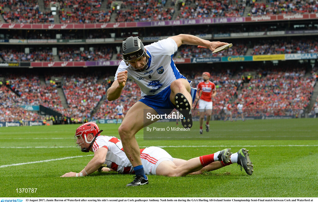 13 August 2017; Jamie Barron of Waterford after scoring his side's second goal as Cork goalkeeper Anthony Nash looks on during the GAA Hurling All-Ireland Senior Championship Semi-Final match between Cork and Waterford at Croke Park in Dublin. Photo by Piaras Ó Mídheach/Sportsfile
