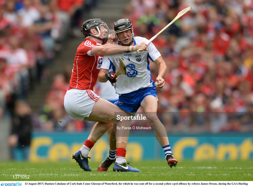 13 August 2017; Damien Cahalane of Cork fouls Conor Gleeson of Waterford, for which he was sent off for a second yellow card offence by referee James Owens, during the GAA Hurling All-Ireland Senior Championship Semi-Final match between Cork and Waterford at Croke Park in Dublin. Photo by Piaras Ó Mídheach/Sportsfile
