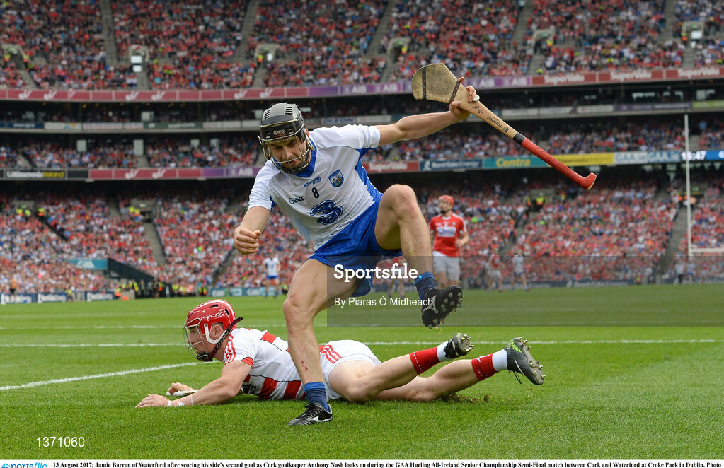 13 August 2017; Jamie Barron of Waterford after scoring his side's second goal as Cork goalkeeper Anthony Nash looks on during the GAA Hurling All-Ireland Senior Championship Semi-Final match between Cork and Waterford at Croke Park in Dublin. Photo by Piaras Ó Mídheach/Sportsfile