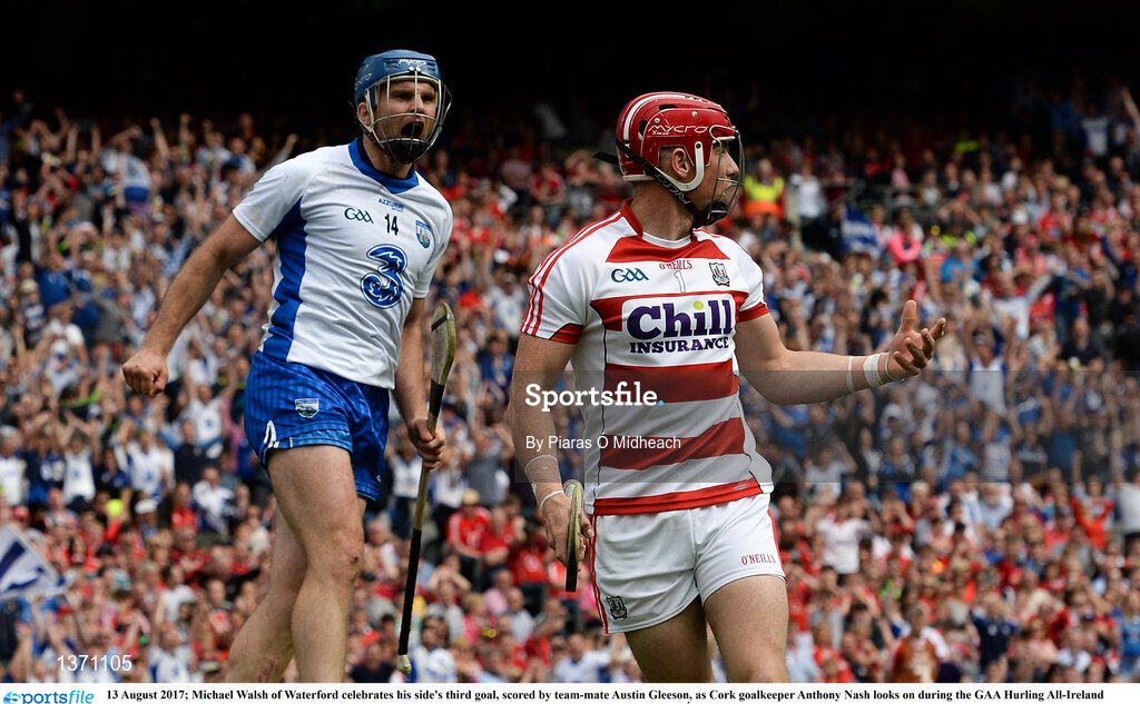 13 August 2017; Michael Walsh of Waterford celebrates his side's third goal, scored by team-mate Austin Gleeson, as Cork goalkeeper Anthony Nash looks on during the GAA Hurling All-Ireland Senior Championship Semi-Final match between Cork and Waterford at Croke Park in Dublin. Photo by Piaras Ó Mídheach/Sportsfile
