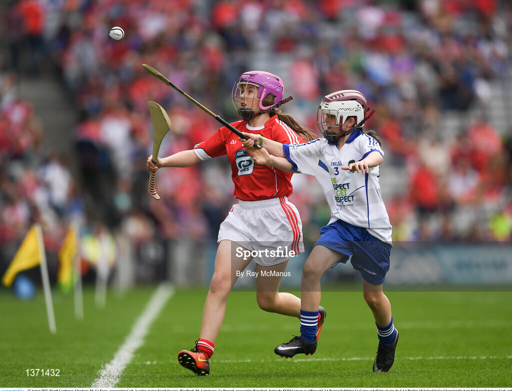 13 August 2017; Niamh Gentleman, Glenderry NS, Co Kerry, representing Cork, in action against Niamh Sweeney, Woodlands NS, Letterkenny, Co Donegal, representing Waterford, during the INTO Cumann na mBunscol GAA Respect Exhibition Go Games at half time during the GAA Hurling All-Ireland Senior Championship Semi-Final match between Cork and Waterford at Croke Park in Dublin. Photo by Ray McManus/Sportsfile
