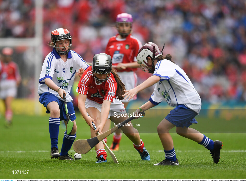 13 August 2017; Amy O’Loughlin, Ard Fhearta NS, Co Kerry, representing Cork, and Niamh Sweeney, Woodlands NS, Letterkenny, Co Donegal, representing Waterford, in action against Muireann Nathan, Divine Word NS, Co Dublin, representing Waterford, during the INTO Cumann na mBunscol GAA Respect Exhibition Go Games at half time during the GAA Hurling All-Ireland Senior Championship Semi-Final match between Cork and Waterford at Croke Park in Dublin. Photo by Ray McManus/Sportsfile