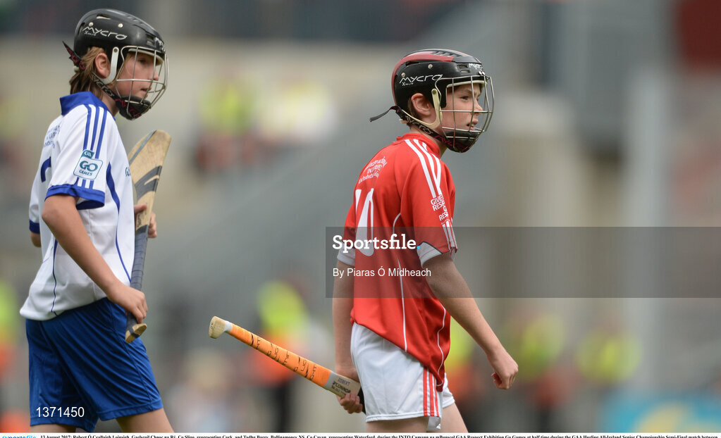 13 August 2017; Robert Ó Ceallaigh Loinsigh, Gaelscoil Chnoc na Ré, Co Sligo, representing Cork, and Tadhg Barry, Ballinamoney NS, Co Cavan, representing Waterford, during the INTO Cumann na mBunscol GAA Respect Exhibition Go Games at half time during the GAA Hurling All-Ireland Senior Championship Semi-Final match between Cork and Waterford at Croke Park in Dublin. Photo by Piaras Ó Mídheach/Sportsfile