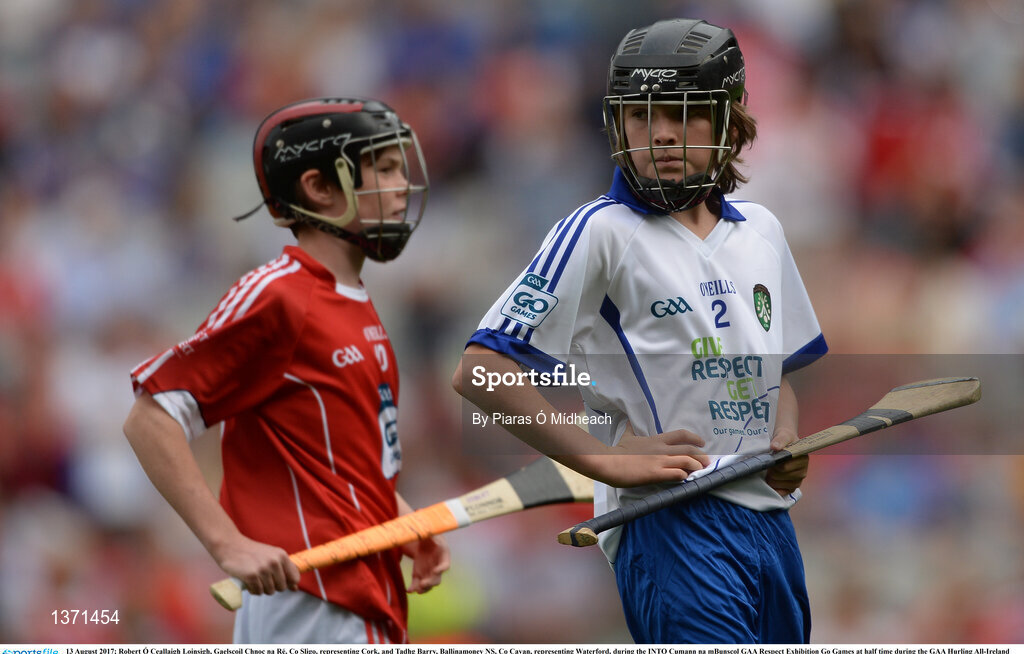 13 August 2017; Robert Ó Ceallaigh Loinsigh, Gaelscoil Chnoc na Ré, Co Sligo, representing Cork, and Tadhg Barry, Ballinamoney NS, Co Cavan, representing Waterford, during the INTO Cumann na mBunscol GAA Respect Exhibition Go Games at half time during the GAA Hurling All-Ireland Senior Championship Semi-Final match between Cork and Waterford at Croke Park in Dublin. Photo by Piaras Ó Mídheach/Sportsfile