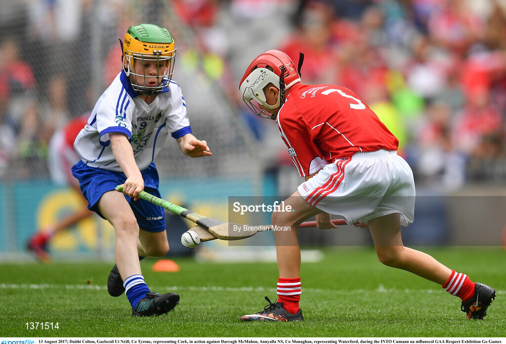 13 August 2017; Daithí Colton, Gaelscoil Uí Néill, Co Tyrone, representing Cork, in action against Darragh McMahon, Annyalla NS, Co Monaghan, representing Waterford, during the INTO Cumann na mBunscol GAA Respect Exhibition Go Games at half time during the GAA Hurling All-Ireland Senior Championship Semi-Final match between Cork and Waterford at Croke Park in Dublin. Photo by Brendan Moran/Sportsfile