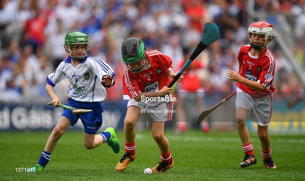 13 August 2017; Oran Tohill, St Johns Primary School, Co Derry, representing Cork, in action against Andrew McManus, St Naile’s PS, Kinawley, Co Fermanagh, representing Waterford, during the INTO Cumann na mBunscol GAA Respect Exhibition Go Games at half time during the GAA Hurling All-Ireland Senior Championship Semi-Final match between Cork and Waterford at Croke Park in Dublin. Photo by Brendan Moran/Sportsfile