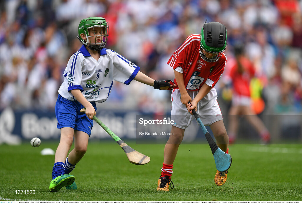 13 August 2017; Oran Tohill, St Johns Primary School, Co Derry, representing Cork, in action against Andrew McManus, St Naile’s PS, Kinawley, Co Fermanagh, representing Waterford, during the INTO Cumann na mBunscol GAA Respect Exhibition Go Games at half time during the GAA Hurling All-Ireland Senior Championship Semi-Final match between Cork and Waterford at Croke Park in Dublin. Photo by Brendan Moran/Sportsfile