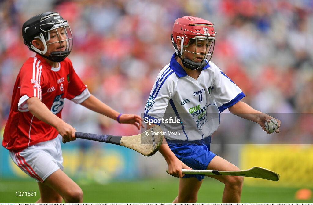 13 August 2017; Michael Óg O’Neill, Glenealy NS, Co Wicklow, representing Waterford, in action against Seán Cooney, Barntown NS, Co Wexford, representing Cork, during the INTO Cumann na mBunscol GAA Respect Exhibition Go Games at half time during the GAA Hurling All-Ireland Senior Championship Semi-Final match between Cork and Waterford at Croke Park in Dublin. Photo by Brendan Moran/Sportsfile