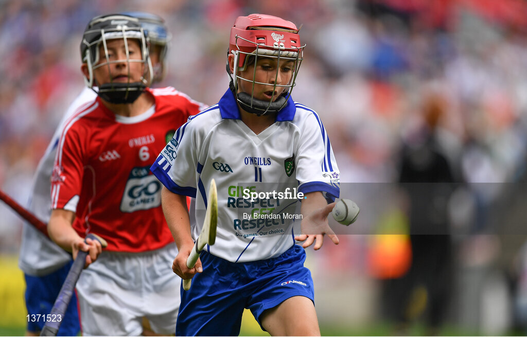 13 August 2017; Michael Óg O’Neill, Glenealy NS, Co Wicklow, representing Waterford, in action against Seán Cooney, Barntown NS, Co Wexford, representing Cork, during the INTO Cumann na mBunscol GAA Respect Exhibition Go Games at half time during the GAA Hurling All-Ireland Senior Championship Semi-Final match between Cork and Waterford at Croke Park in Dublin. Photo by Brendan Moran/Sportsfile