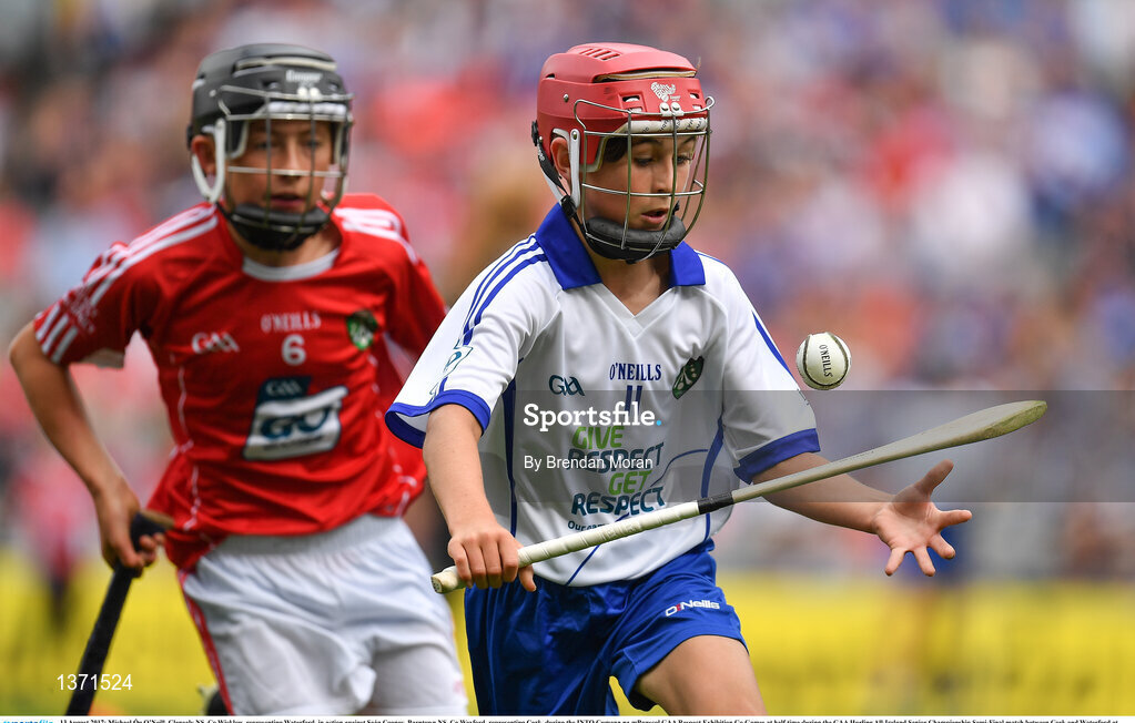 13 August 2017; Michael Óg O’Neill, Glenealy NS, Co Wicklow, representing Waterford, in action against Seán Cooney, Barntown NS, Co Wexford, representing Cork, during the INTO Cumann na mBunscol GAA Respect Exhibition Go Games at half time during the GAA Hurling All-Ireland Senior Championship Semi-Final match between Cork and Waterford at Croke Park in Dublin. Photo by Brendan Moran/Sportsfile