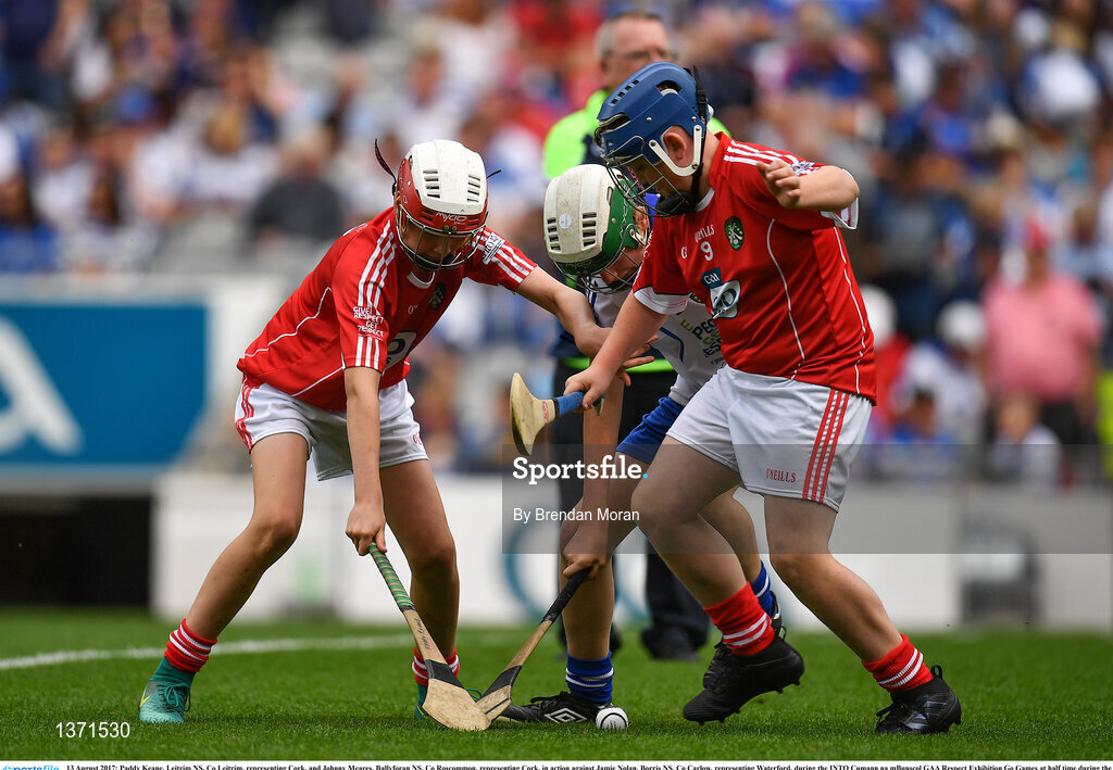 13 August 2017; Paddy Keane, Leitrim NS, Co Leitrim, representing Cork, and Johnny Meares, Ballyforan NS, Co Roscommon, representing Cork, in action against Jamie Nolan, Borris NS, Co Carlow, representing Waterford, during the INTO Cumann na mBunscol GAA Respect Exhibition Go Games at half time during the GAA Hurling All-Ireland Senior Championship Semi-Final match between Cork and Waterford at Croke Park in Dublin. Photo by Brendan Moran/Sportsfile