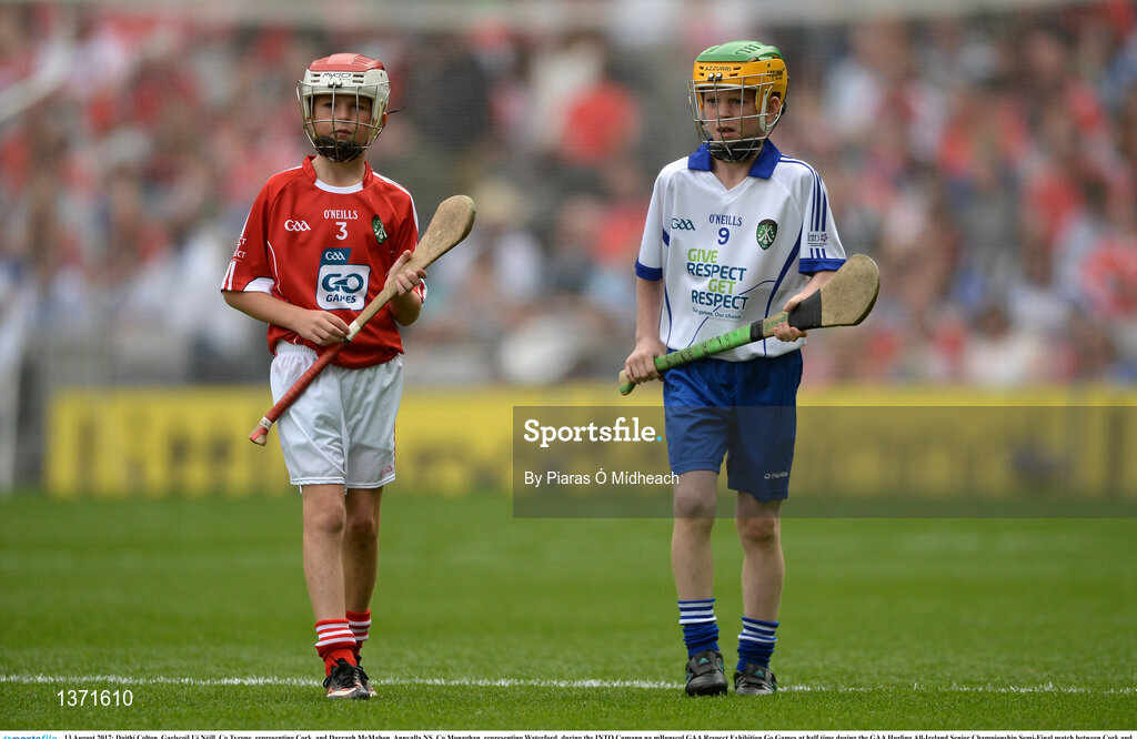 13 August 2017; Daithí Colton, Gaelscoil Uí Néill, Co Tyrone, representing Cork, and Darragh McMahon, Annyalla NS, Co Monaghan, representing Waterford, during the INTO Cumann na mBunscol GAA Respect Exhibition Go Games at half time during the GAA Hurling All-Ireland Senior Championship Semi-Final match between Cork and Waterford at Croke Park in Dublin. Photo by Piaras Ó Mídheach/Sportsfile