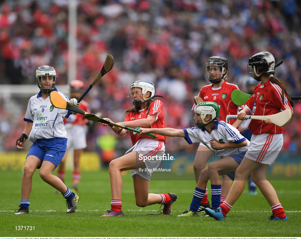 13 August 2017; Alison Healy, Rathcoffey NS, Co Kildare, representing Cork, in action against Claire Doheny, left, Kilmanagh NS, Co Kilkenny, representing Waterford, and Aisling Morey, Sixmilebridge NS, Co Clare, representing Waterford, during the INTO Cumann na mBunscol GAA Respect Exhibition Go Games at half time during the GAA Hurling All-Ireland Senior Championship Semi-Final match between Cork and Waterford at Croke Park in Dublin. Photo by Ray McManus/Sportsfile