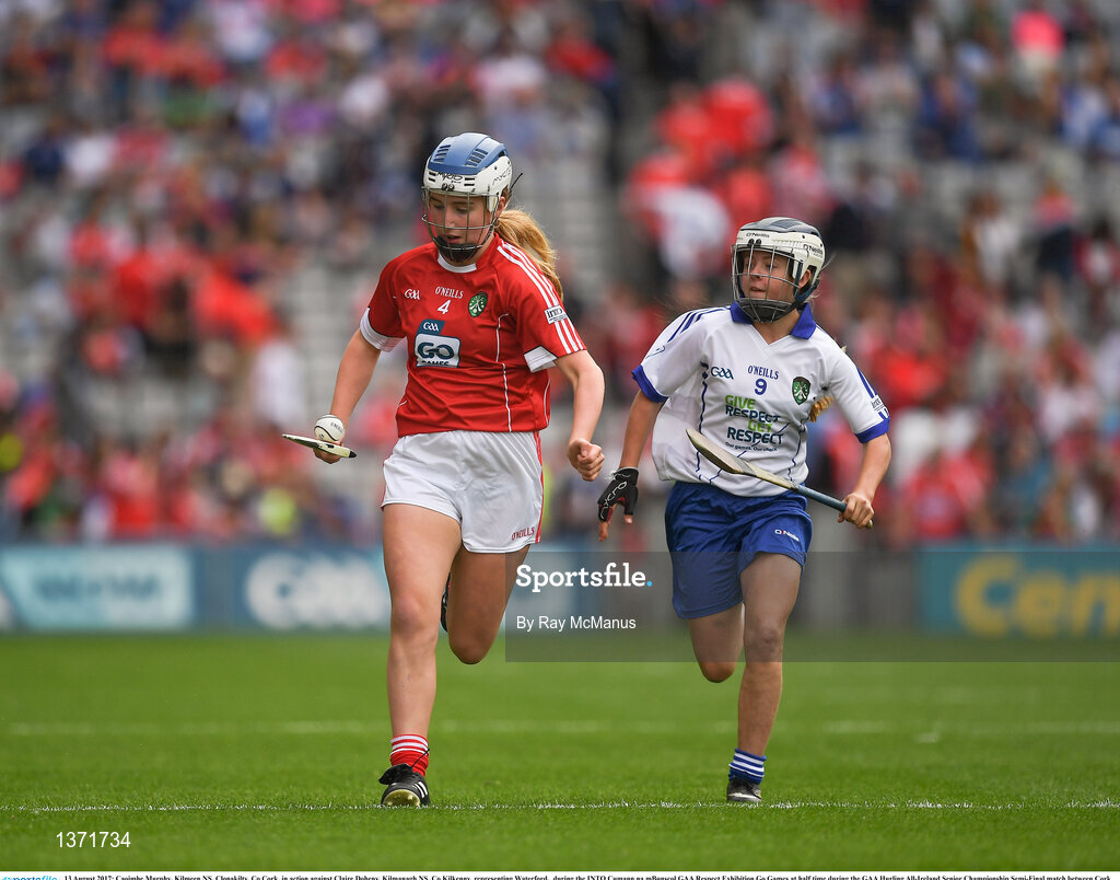 13 August 2017; Caoimhe Murphy, Kilmeen NS, Clonakilty, Co Cork, in action against Claire Doheny, Kilmanagh NS, Co Kilkenny, representing Waterford, during the INTO Cumann na mBunscol GAA Respect Exhibition Go Games at half time during the GAA Hurling All-Ireland Senior Championship Semi-Final match between Cork and Waterford at Croke Park in Dublin. Photo by Ray McManus/Sportsfile