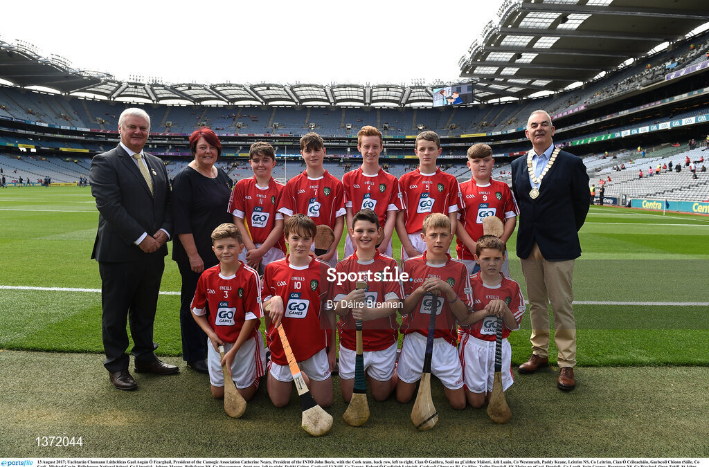 13 August 2017; Uachtarán Chumann Lúthchleas Gael Aogán Ó Fearghaíl, President of the Camogie Association Catherine Neary, President of the INTO John Boyle, with the Cork team, back row, left to right, Cian Ó Gadhra, Scoil na gCeithre Máistrí, Áth Luain, Co Westmeath, Paddy Keane, Leitrim NS, Co Leitrim, Cian Ó Céileacháin, Gaelscoil Chionn tSáile, Co Cork, Michael Gavin, Ballybrown National School, Co Limerick, Johnny Meares, Ballyforan NS, Co Roscommon, front row, left to right, Daithí Colton, Gaelscoil Uí Néill, Co Tyrone, Robert Ó Ceallaigh Loinsigh, Gaelscoil Chnoc na Rí, Co Sligo, Tadhg Dowdall, SN Muire na nGael, Dundalk, Co Louth, Seán Cooney, Barntown NS, Co Wexford, Oran Tohill, St Johns Primary School, Co Derry, ahead of the INTO Cumann na mBunscol GAA Respect Exhibition Go Games at Galway v Tipperary - GAA Hurling All-Ireland Senior Championship Semi-Final at Croke Park in Dublin. Photo by Daire Brennan/Sportsfile