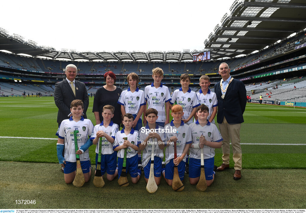 13 August 2017; Uachtarán Chumann Lúthchleas Gael Aogán Ó Fearghaíl, President of the Camogie Association Catherine Neary, President of the INTO John Boyle, with the Waterford team, back row, left to right, Tadhg Barry, Ballinamoney NS, Co Cavan, Eoin O'Brien, Bunscoil Bhóthar na Naomh, Lismore, Co Waterford, Senan Phelan, St Olaf's NS, Co Dublin, Luke Doheny, Ballysloe NS, Co Tipperary, fron row, left to right, Fiachra O'Gorman, St Joseph's Boys NS, Carrickmacross, Co Monaghan, Andrew McManus, St Naile's PS, Kinawley, Co Fermanagh, Darragh McMahon, Annyalla NS, Co Monaghan, Michael Óg O'Neill, Glenealy NS, Co Wicklow, Jamie Nolan, Borris NS, Co Carlow, Daniel Broderick, St Brigid's BNS, Co Dublin, ahead of the INTO Cumann na mBunscol GAA Respect Exhibition Go Games at Galway v Tipperary - GAA Hurling All-Ireland Senior Championship Semi-Final at Croke Park in Dublin. Photo by Daire Brennan/Sportsfile