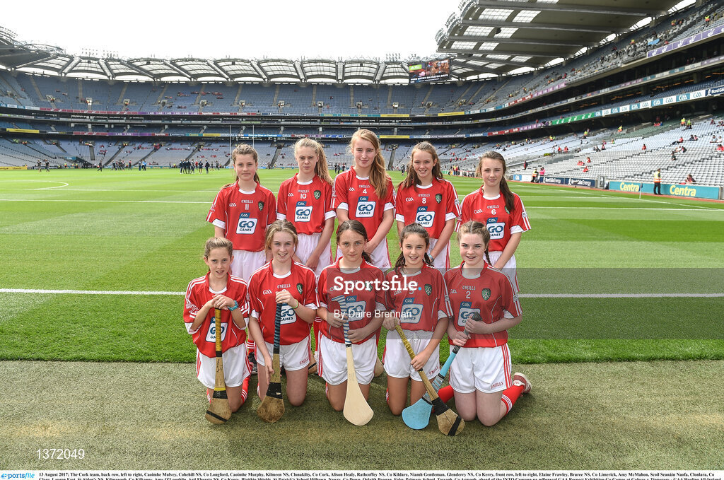 13 August 2017; The Cork team, back row, left to right, Caoimhe Mulvey, Cohehill NS, Co Longford, Caoimhe Murphy, Kilmeen NS, Clonakilty, Co Cork, Alison Healy, Rathcoffey NS, Co Kildare, Niamh Gentleman, Glenderry NS, Co Kerry, front row, left to right, Elaine Frawley, Bruree NS, Co Limerick, Amy McMahon, Scoil Seanáin Naofa, Clonlara, Co Clare, Lauren East, St Aiden's NS, Kilmanagh, Co Kilkenny, Amy O'Loughlin, Ard Fhearta NS, Co Kerry, Blaithin Shields, St Patrick's School Hilltown, Newry, Co Down, Orlaith Beagan, Foley Primary School, Tassagh, Co Armagh, ahead of the INTO Cumann na mBunscol GAA Respect Exhibition Go Games at Galway v Tipperary - GAA Hurling All-Ireland Senior Championship Semi-Final at Croke Park in Dublin. Photo by Daire Brennan/Sportsfile