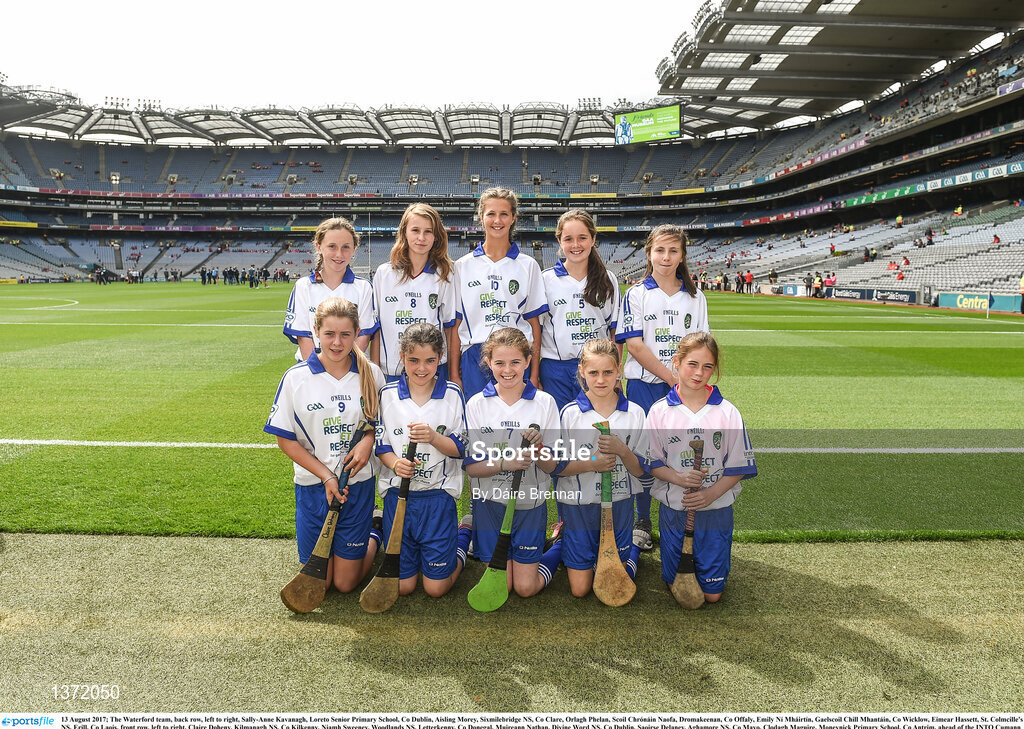 13 August 2017; The Waterford team, back row, left to right, Sally-Anne Kavanagh, Loreto Senior Primary School, Co Dublin, Aisling Morey, Sixmilebridge NS, Co Clare, Orlagh Phelan, Scoil Chrónáin Naofa, Dromakeenan, Co Offaly, Emily Ní Mháirtín, Gaelscoil Chill Mhantáin, Co Wicklow, Eimear Hassett, St. Colmcille's NS, Erill, Co Laois, front row, left to right, Claire Doheny, Kilmanagh NS, Co Kilkenny, Niamh Sweeney, Woodlands NS, Letterkenny, Co Donegal, Muireann Nathan, Divine Word NS, Co Dublin, Saoirse Delaney, Aghamore NS, Co Mayo, Clodagh Maguire, Moneynick Primary School, Co Antrim, ahead of the INTO Cumann na mBunscol GAA Respect Exhibition Go Games at Galway v Tipperary - GAA Hurling All-Ireland Senior Championship Semi-Final at Croke Park in Dublin. Photo by Daire Brennan/Sportsfile