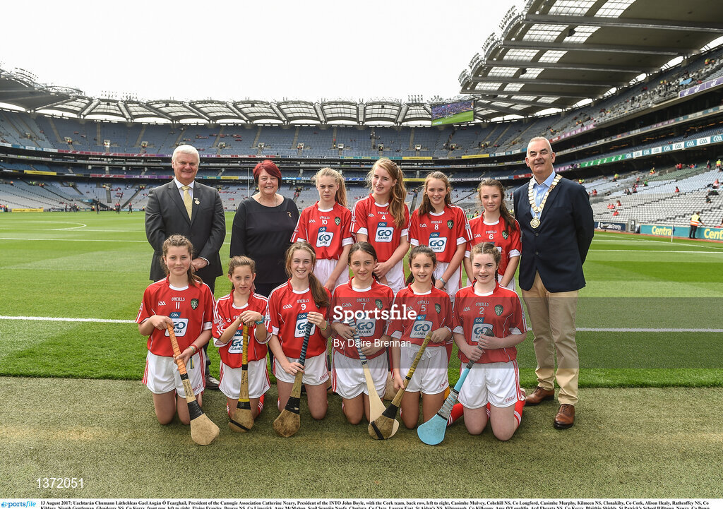 13 August 2017; Uachtarán Chumann Lúthchleas Gael Aogán Ó Fearghaíl, President of the Camogie Association Catherine Neary, President of the INTO John Boyle, with the Cork team, back row, left to right, Caoimhe Mulvey, Cohehill NS, Co Longford, Caoimhe Murphy, Kilmeen NS, Clonakilty, Co Cork, Alison Healy, Rathcoffey NS, Co Kildare, Niamh Gentleman, Glenderry NS, Co Kerry, front row, left to right, Elaine Frawley, Bruree NS, Co Limerick, Amy McMahon, Scoil Seanáin Naofa, Clonlara, Co Clare, Lauren East, St Aiden's NS, Kilmanagh, Co Kilkenny, Amy O'Loughlin, Ard Fhearta NS, Co Kerry, Blaithin Shields, St Patrick's School Hilltown, Newry, Co Down, Orlaith Beagan, Foley Primary School, Tassagh, Co Armagh, ahead of the INTO Cumann na mBunscol GAA Respect Exhibition Go Games at Galway v Tipperary - GAA Hurling All-Ireland Senior Championship Semi-Final at Croke Park in Dublin. Photo by Daire Brennan/Sportsfile