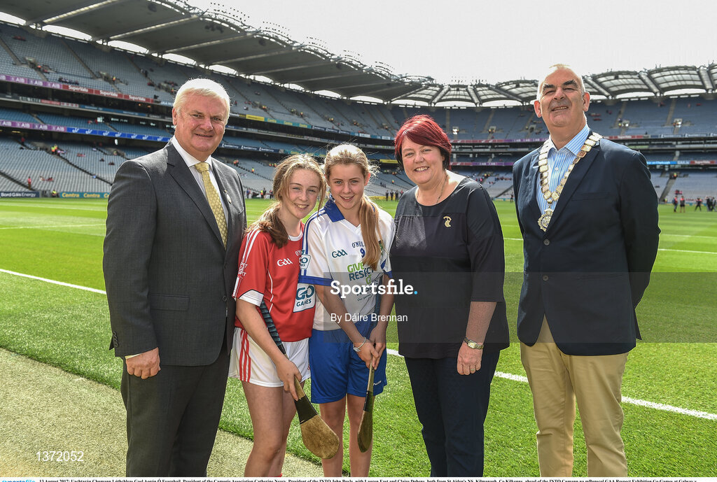 13 August 2017; Uachtarán Chumann Lúthchleas Gael Aogán Ó Fearghaíl, President of the Camogie Association Catherine Neary, President of the INTO John Boyle, with Lauren East and Claire Doheny, both from St Aiden's NS, Kilmanagh, Co Kilkenny, ahead of the INTO Cumann na mBunscol GAA Respect Exhibition Go Games at Galway v Tipperary - GAA Hurling All-Ireland Senior Championship Semi-Final at Croke Park in Dublin. Photo by Daire Brennan/Sportsfile