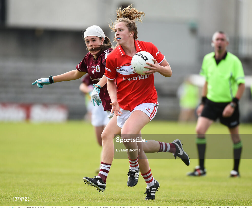 19 August 2017; Maire O'Callaghan of Cork in action against Shauna Hynes of Galway during the TG4 Ladies Football All-Ireland Senior Championship Quarter-Final match between Cork and Galway at Cusack Park in Westmeath. Photo by Matt Browne/Sportsfile