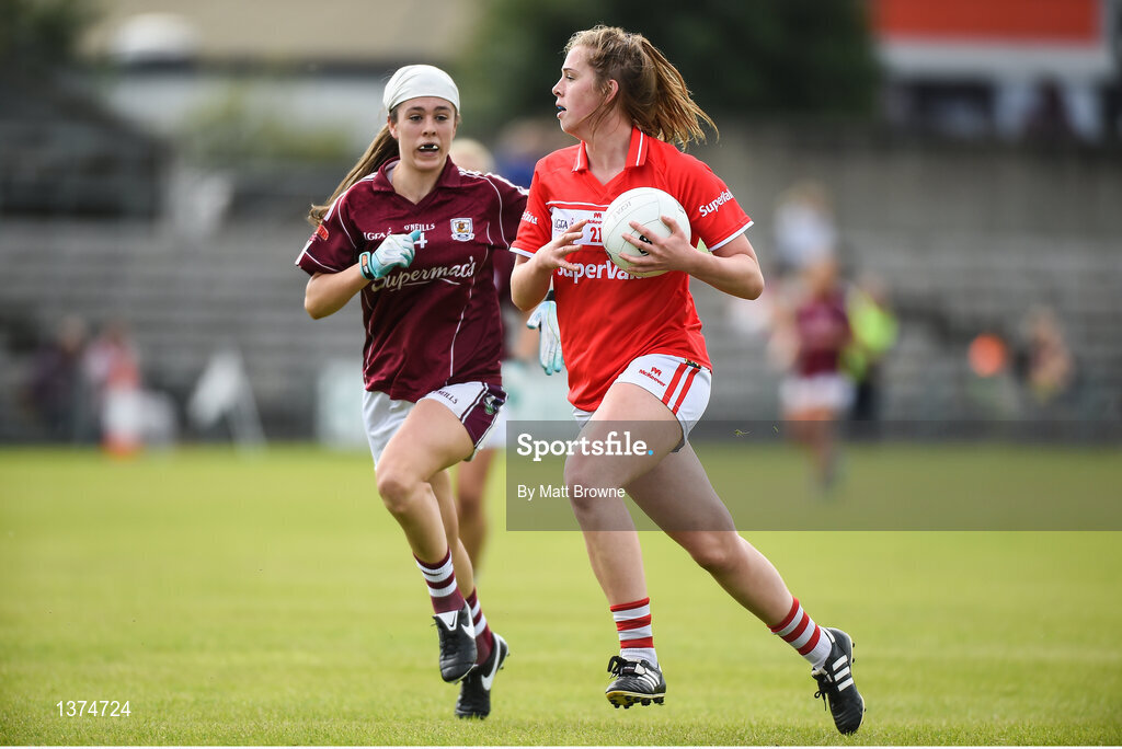 19 August 2017; Maire O'Callaghan of Cork in action against Shauna Hynes of Galway during the TG4 Ladies Football All-Ireland Senior Championship Quarter-Final match between Cork and Galway at Cusack Park in Westmeath. Photo by Matt Browne/Sportsfile