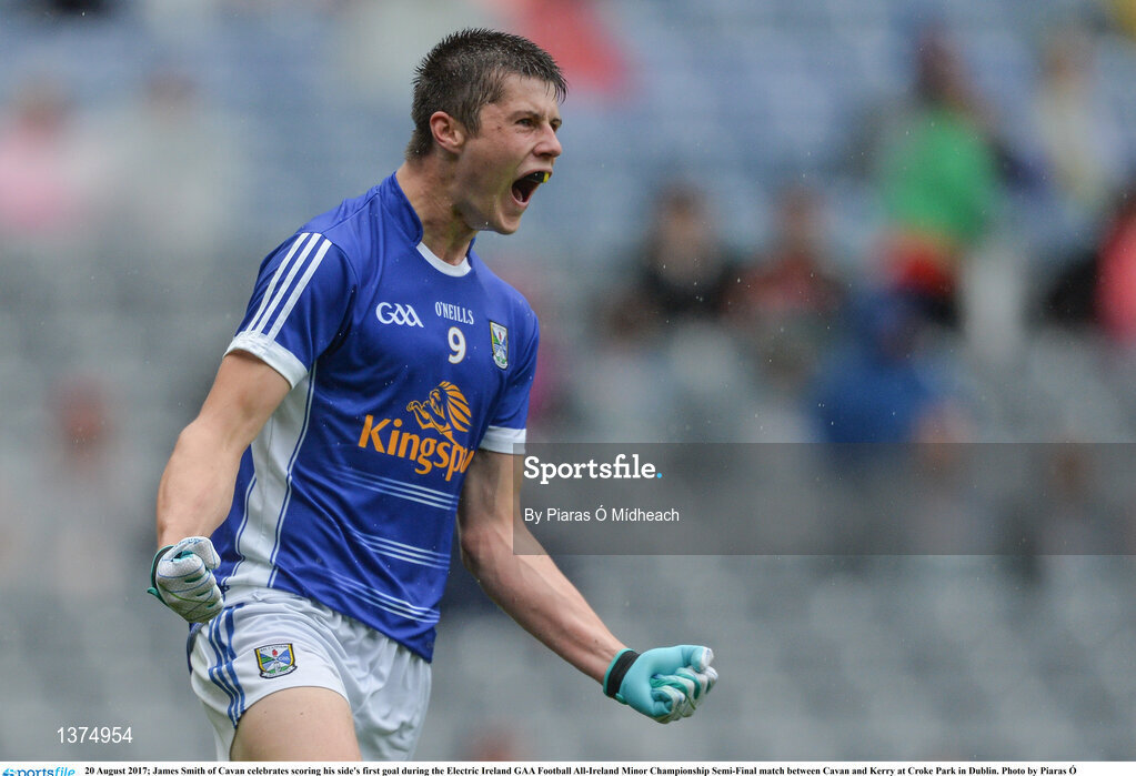 20 August 2017; James Smith of Cavan celebrates scoring his side's first goal during the Electric Ireland GAA Football All-Ireland Minor Championship Semi-Final match between Cavan and Kerry at Croke Park in Dublin. Photo by Piaras Ó Mídheach/Sportsfile