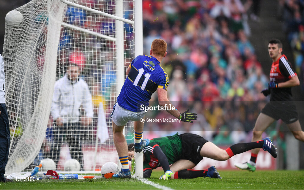 20 August 2017; Johnny Buckley of Kerry shoots to score his side's second goal past Mayo goalkeeper David Clarke during the GAA Football All-Ireland Senior Championship Semi-Final match between Kerry and Mayo at Croke Park in Dublin. Photo by Stephen McCarthy/Sportsfile